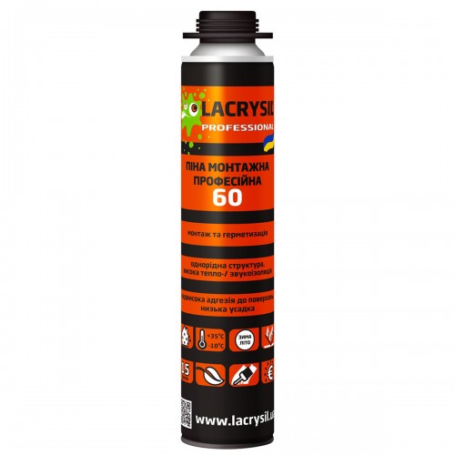 Професійна монтажна піна Lacrysil 60 (750 мл) — це надійний однокомпонентний поліуретановий матеріал, розроблений для професійного використання при виконанні монтажних, ізоляційних та герметизаційних робіт. Завдяки збалансованому складу, піна утворює однорідну дрібнопористу структуру, що забезпечує високу якість заповнення швів та надійну фіксацію елементів.
