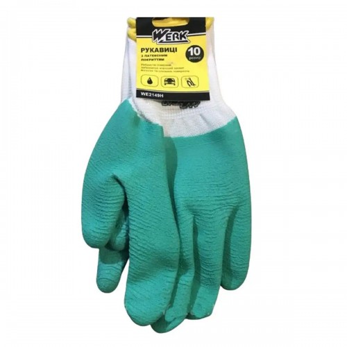 Рукавички полiестер білі, зелене ребристе латексне покриття з підвіскою, р.10 WERK (WE2149H)